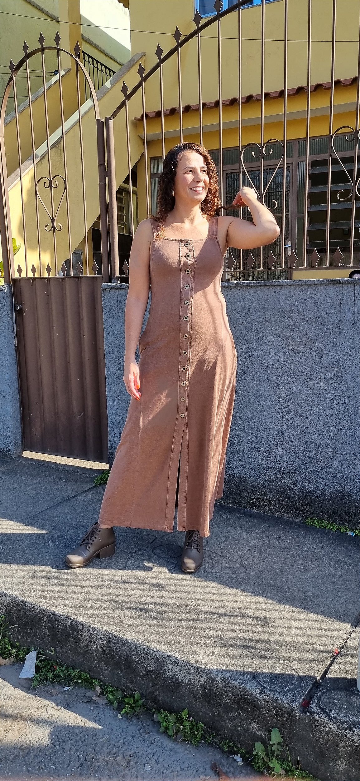 O vestido Gabriela modelo longo com comprimento até os pés. Ele possui alças largas e um decote reto, conferindo um visual casual e confortável. Conta com abotoamento frontal completo, com botões médios arredondados, em tom amadeirado.